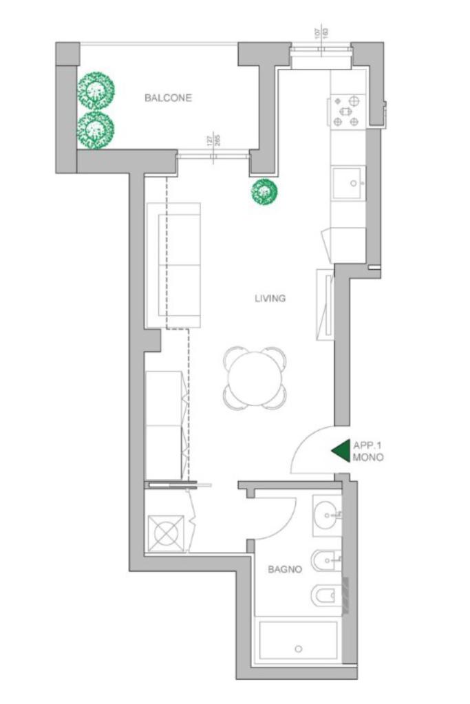 Gli spazi interni saranno organizzati per garantire la massima funzionalità, con una zona living ben studiata e collegata direttamente al balcone, doccia walking in nicchia e pratico angolo lavanderia. Un’abitazione ideale sia come punto d’appoggio moderno in città, sia come opportunità di investimento in una zona strategica e di forte interesse.
